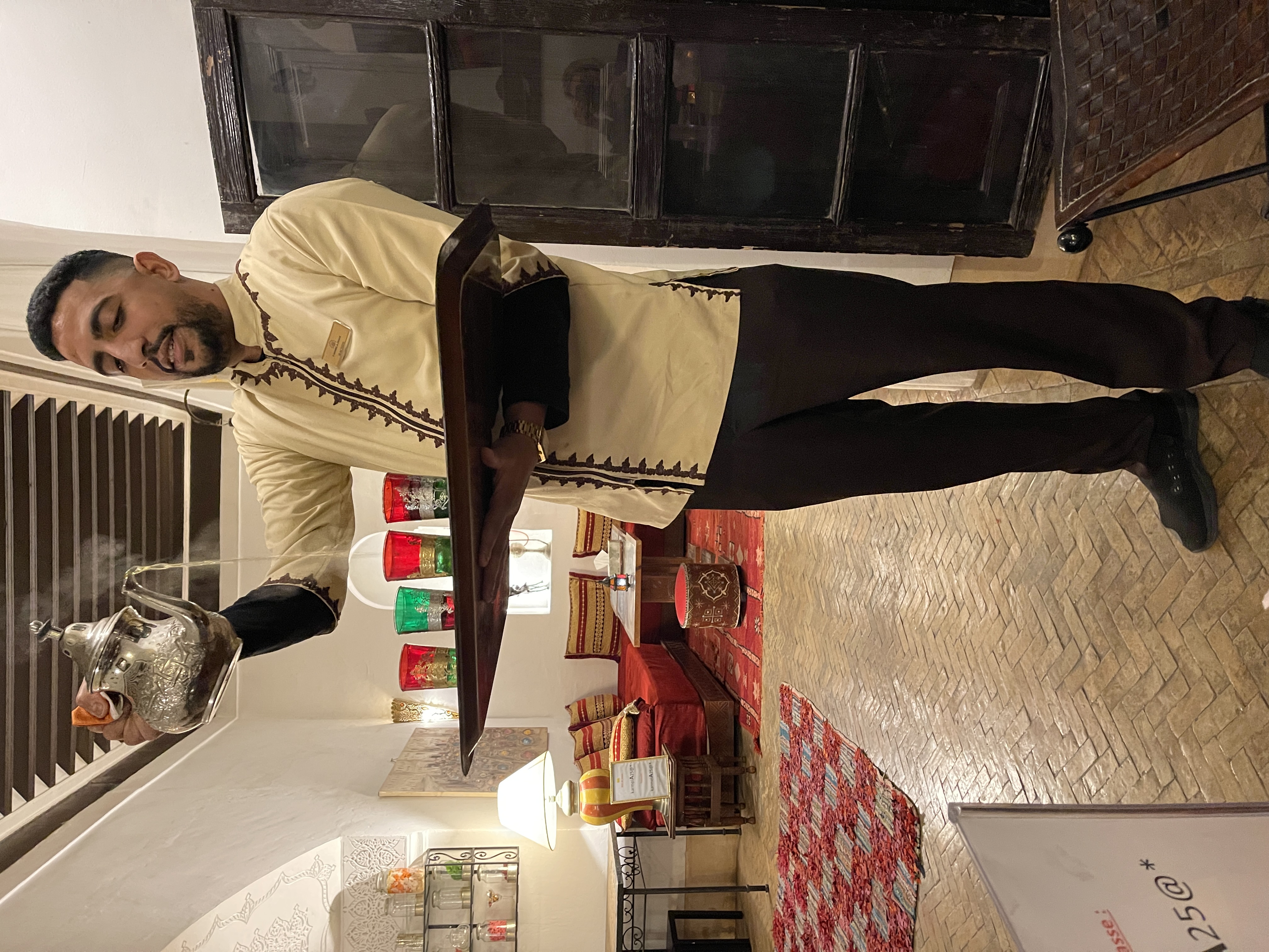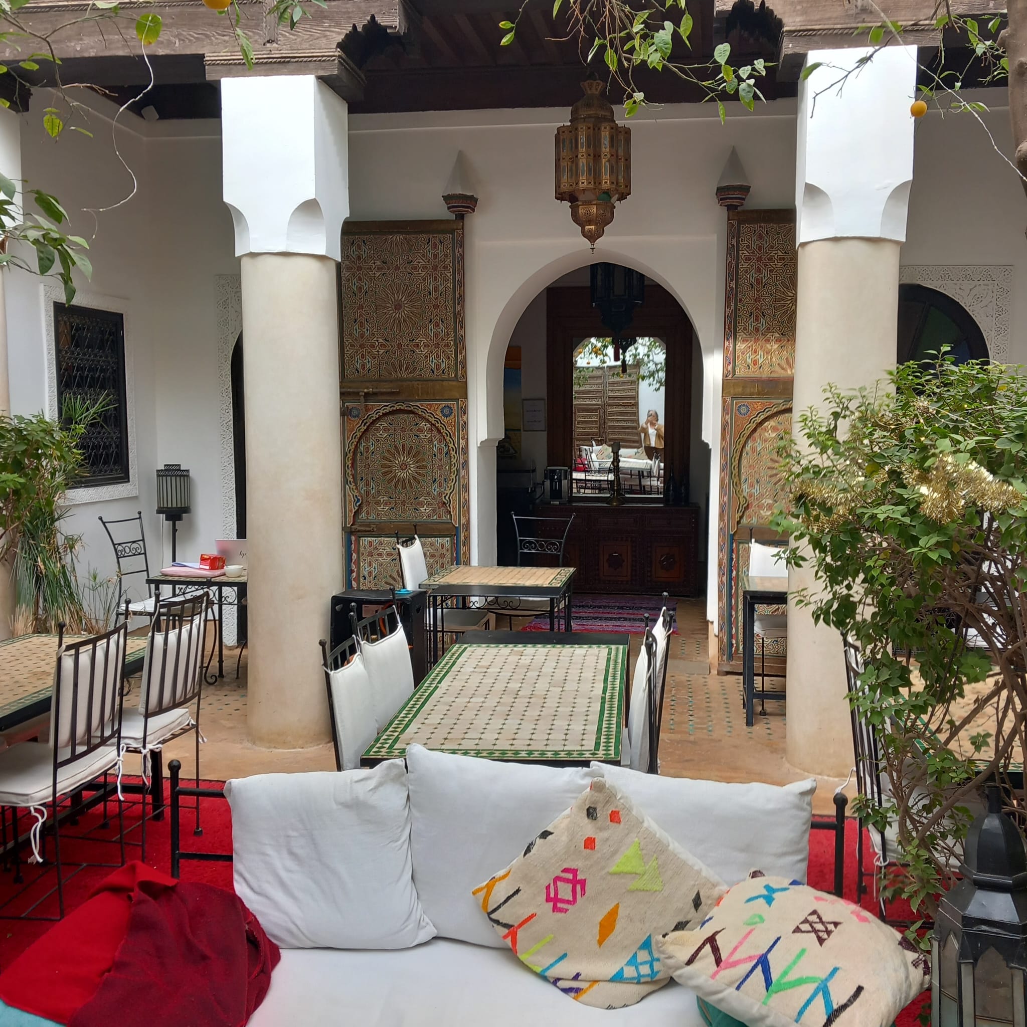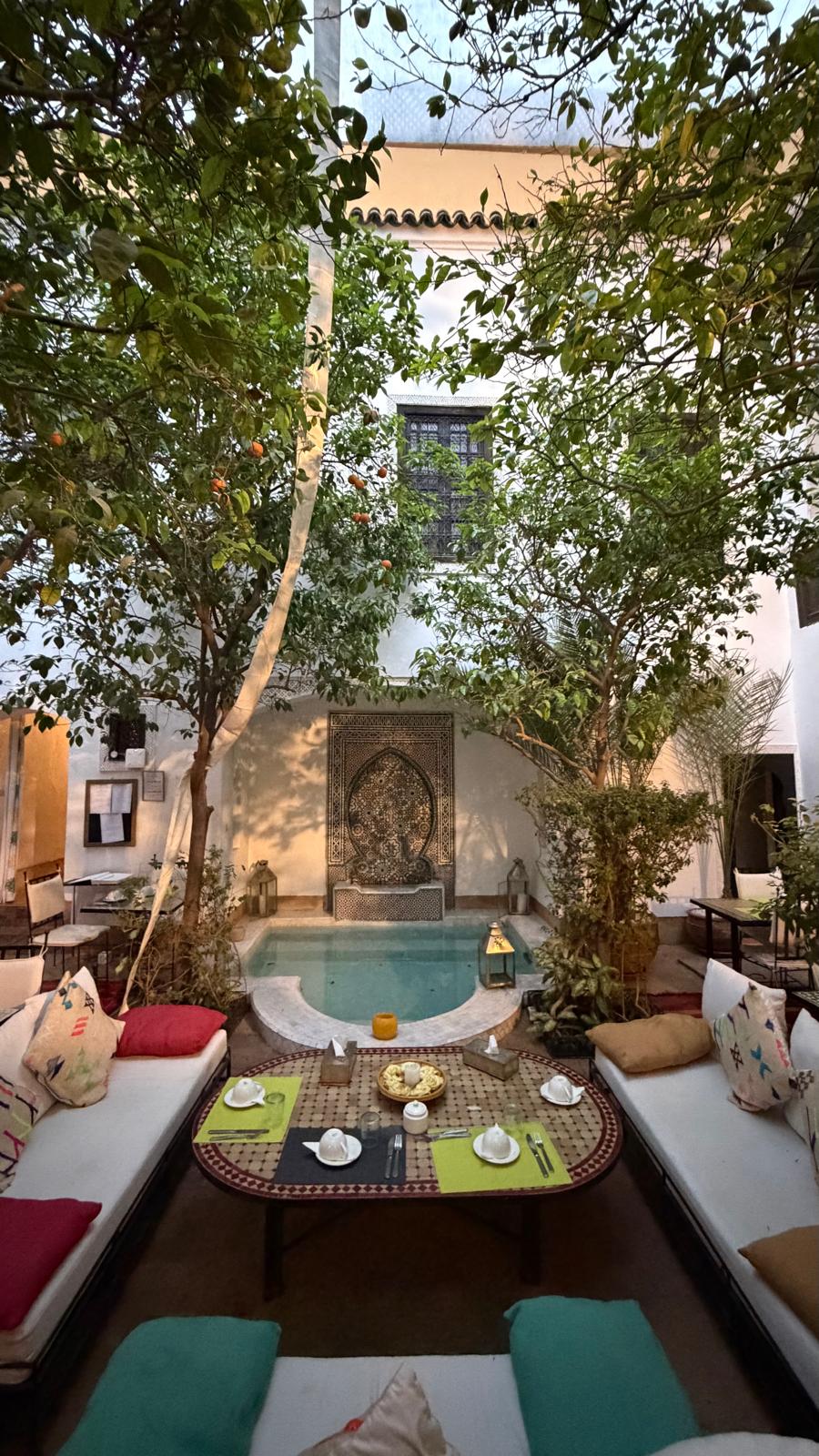 “ Door een wirwar van straatjes, een steeg en een tunnel, kwamen we aan in Riad Karmela. Mooie binnenplaats met bomen en leuke zitjes. Het personeel was vriendelijk en behulpzaam, het ontbijt goed en het diner was heerlijk. Onze kamer was in de naastgelegen riad: heel ruim, schoon, wel aan de donkere kant. Op het dak was een prachtig terras met ligstoelen, een mini zwembad en verschillende zitjes. Riad Karmela bevindt zich middenin het centrum van de medina. Daardoor konden wij lopend naar de beginpunten van onze excursies, heel fijn. “